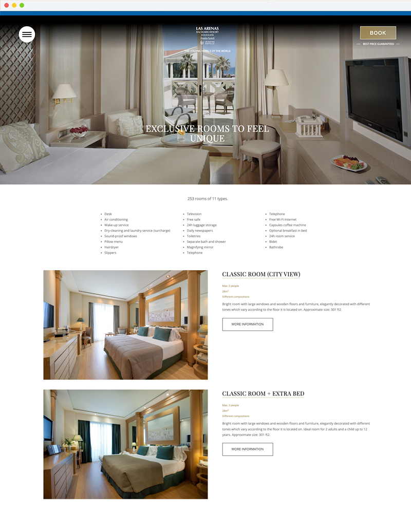 Our “Rooms” section is conceived to show all relevant information for every room, occupation, bed typology, square metres, room equipment and it even shows the offers associated to that particular room so that you can reserve it directly.